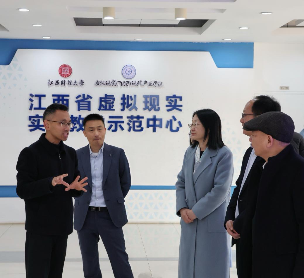 虚拟现实(VR)现代产业学院 2025年12月31日上午,上海对外经贸大学WTO亚太培训中心主任、上海市国际贸易学会会长黄建忠一行5人莅临麻豆在线 ,围绕VR技术与数字经济、国际贸易领域的融合应用、人才培养创新及产教深度融合举措与建设成效等议题开展深度调研。学院院长万征、党委书记彭敏,副院长李华旸、党委副书记刘前,党委委员兼教务办主任吴洁及相关部门负责人陪同考察。