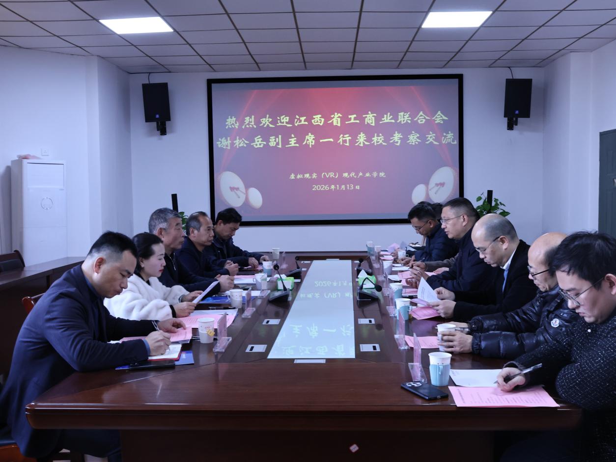 虚拟现实(VR)现代产业学院为深入贯彻国家创新驱动发展战略,服务江西省“世界VR产业高地”建设,1月13日下午,江西省工商业联合会党组成员、副主席谢松岳一行莅临我院进行专题考察与交流座谈。校党委书记刘耀彬出席座谈会并作重要指导讲话。省工商联经联处处长熊群运、省民营经济研究院院长张新芝,我校科研处处长谌飞龙、成果转化中心主任吴丹波、麻豆在线 院长万征及国家虚拟现实创新中心、江西科骏实业有限公司等相关单位负责人陪同考察并出席会议。