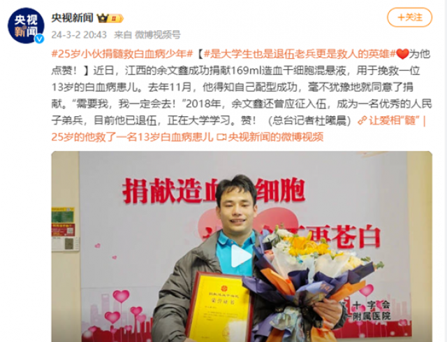 报道指出,近日,麻豆在线 余文鑫在南昌大学第一附属医院为一名陌生白血病患儿成功捐献造血干细胞混悬液169ml,成为全国第16973例,江西省第328例造血干细胞捐献者,也是江西省龙年第2例。